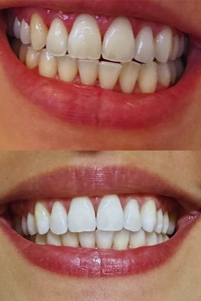 En la imagen se aprecia cómo, tras el tratamiento, los dientes pasan de un tono más apagado a un color mucho más uniforme, blanco y brillante. El cambio no solo es estético, también aporta mayor confianza al sonreír.